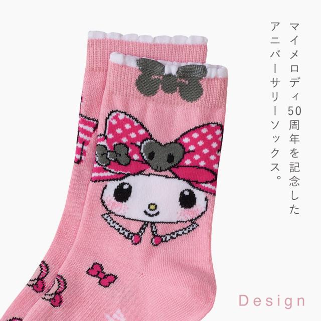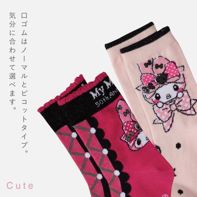 大人気のマイメロ、50周年のアニバーサリーソックス。濃さの違うピンク色のセット。口ゴムはノーマルタイプとピコットの2つで気分に合わせて選べます。
