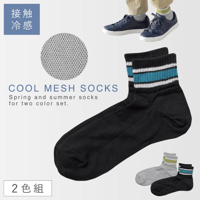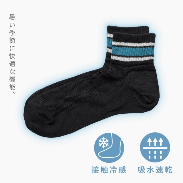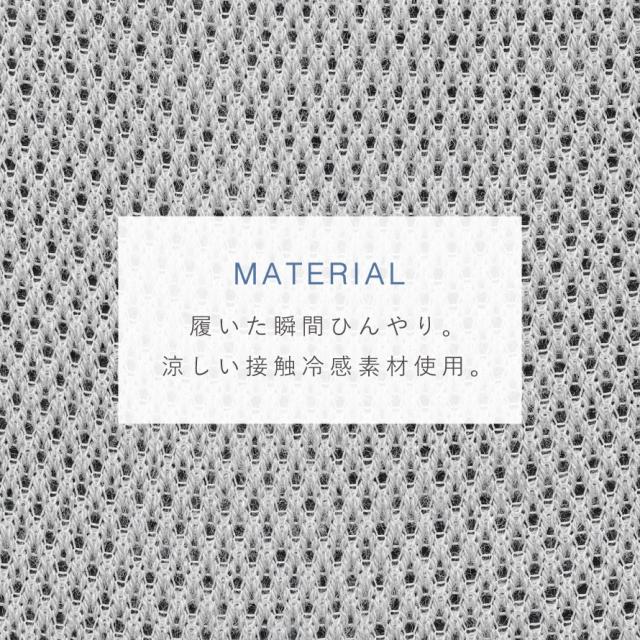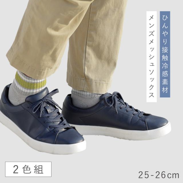 接触冷感素材。メッシュ素材のさわやかメンズソックス。履いた瞬間ひんやり。涼しい接触冷感素材使用。