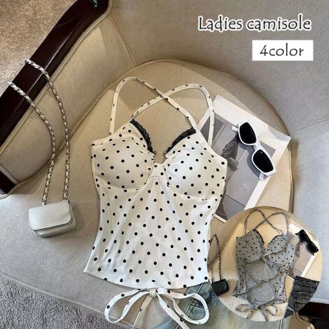 キャミソール レディース 女性 トップス インナー 背中見せ 背中開き カップ付き バッククロス リボン ドット柄 紐 ひも セ