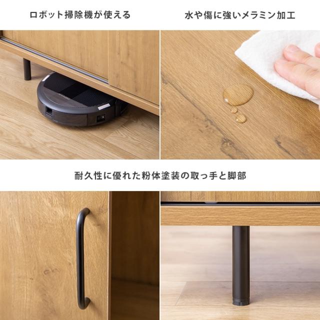 ブラックアイアンの脚と取っ手が空間を引き締め、ロボット掃除機にも対応した設計でお手入れもラクラク。