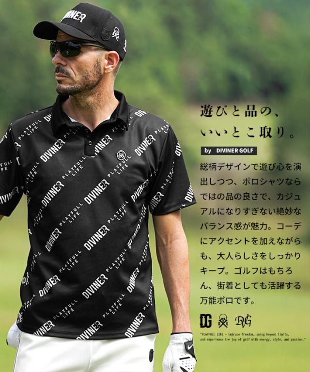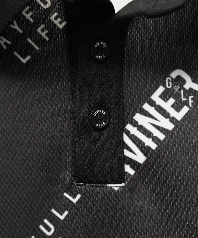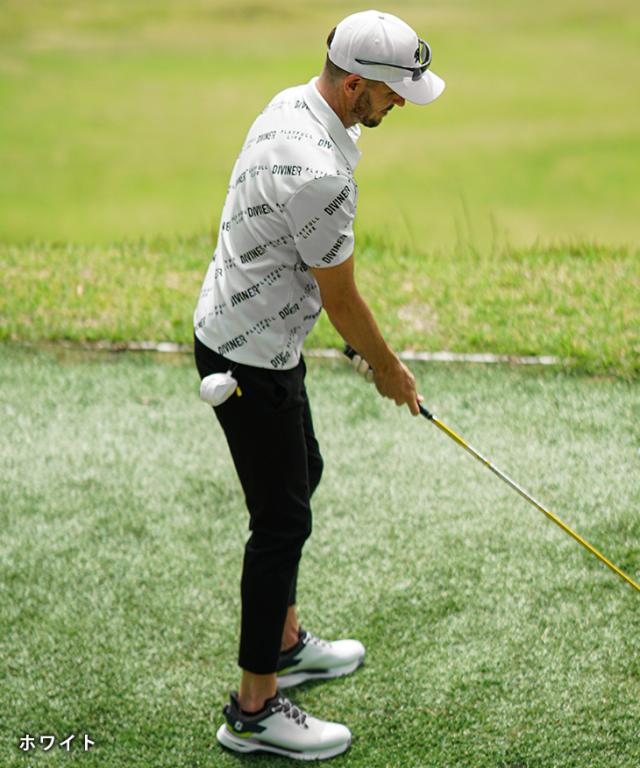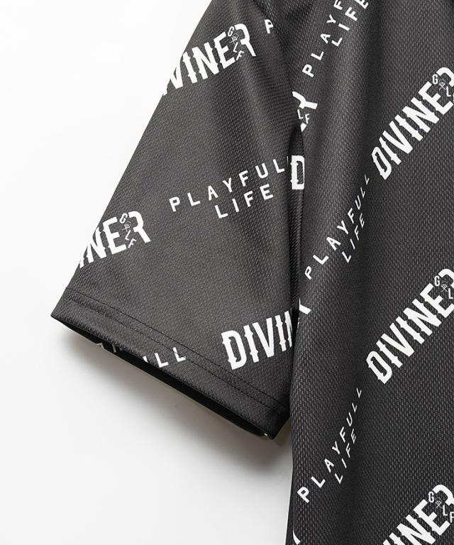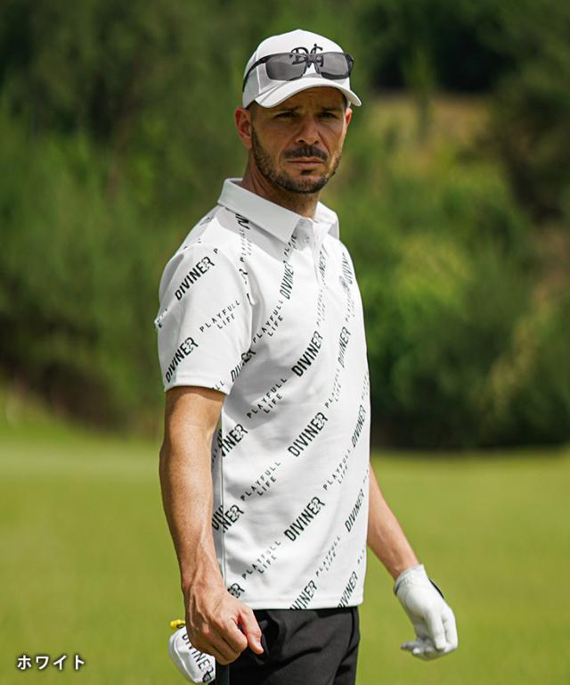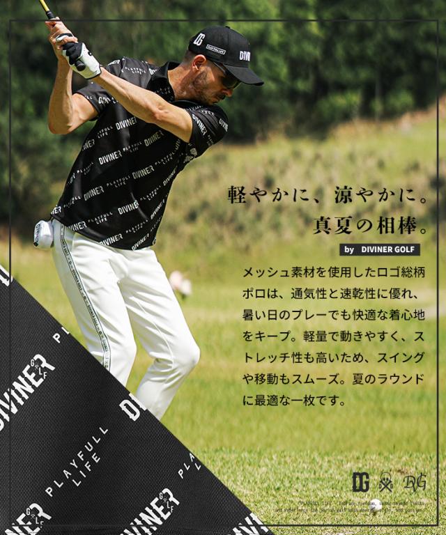 DIVINER GOLF(ディバイナーゴルフ)『総柄ロゴメッシュポロ』【総柄ロゴメッシュポロシャツ】■Design / デザイン“攻めすぎない柄で、印象に差をつける。”斜めに走るブランドロゴの総柄デザインが、単調になりがちなゴルフスタイルに程よいアクセントをプラス。ブラックとホワイトの2色展開で、柄の存在感を残しつつも上品に仕上げました。シルエットはやや細身。丈はジャストで、すっきりとした印象に。ベーシックな襟元に、さりげなく添えたオリジナルワッペンがワンポイントに映えます。さらっとした着心地で、プレー中も快適。控えめだけど、ちょっと攻めてる——そんな大人の余裕を感じさせる一枚です。