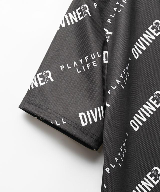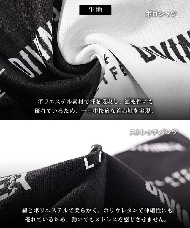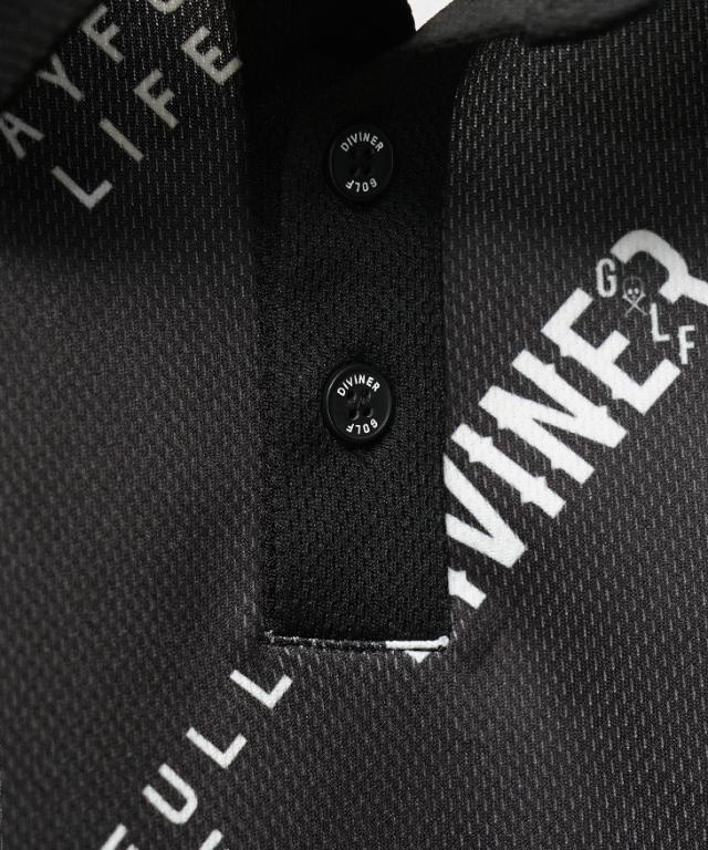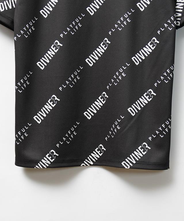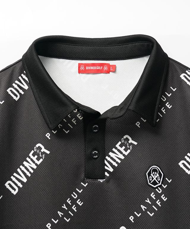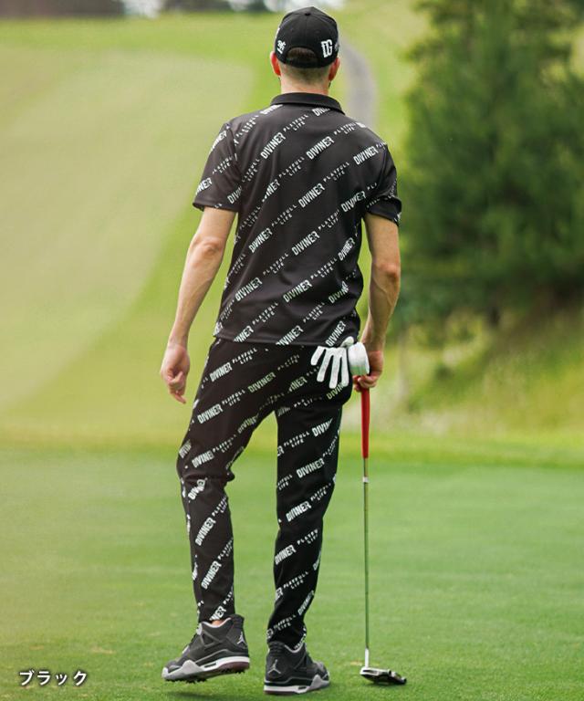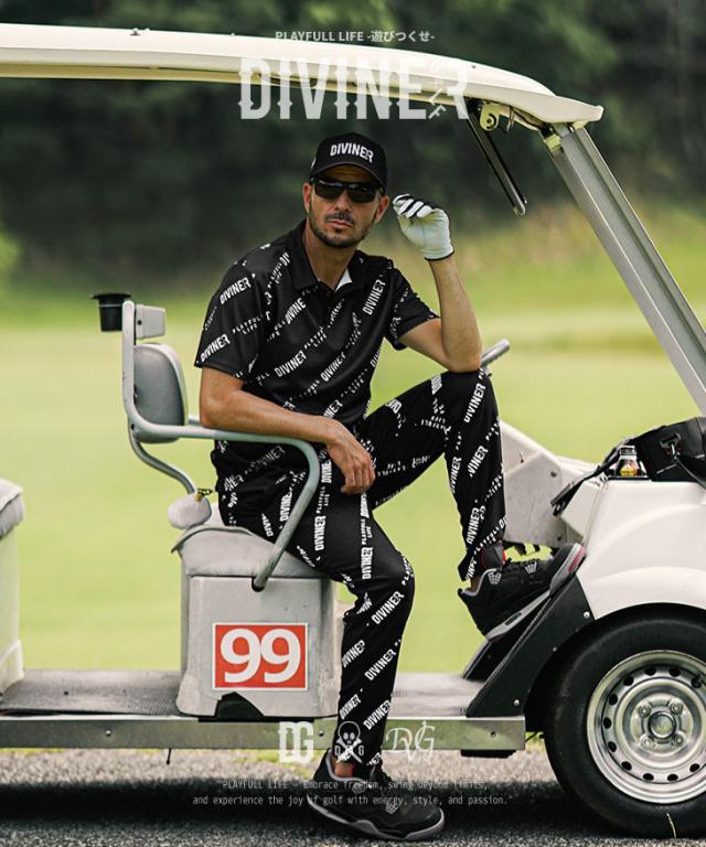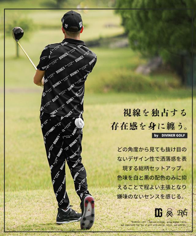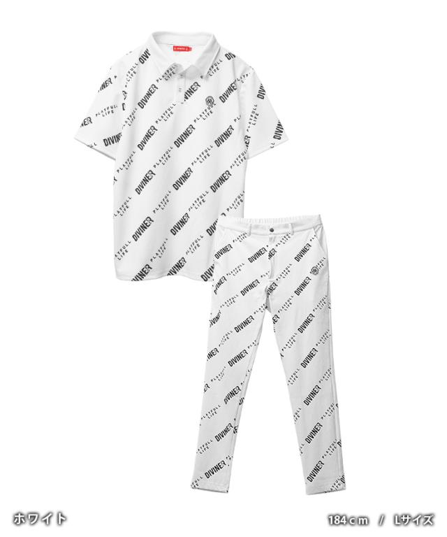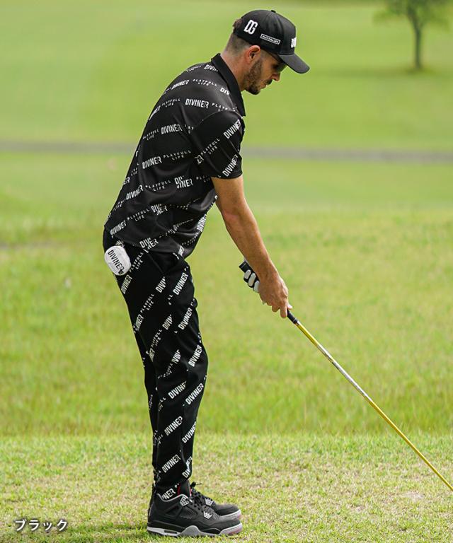 DIVINER GOLF(ディバイナーゴルフ)『総柄ロゴセットアップ』【総柄ロゴセットアップ】■Design / デザイン“攻めすぎず、埋もれない。大人のゴルフスタイルにちょうどいい。”斜めに走るブランドロゴの総柄が、シンプルにまとまりがちなゴルフウェアに程よい存在感をプラス。ブラックとホワイトのモノトーン配色で、派手になりすぎず、品よくきまるデザインです。トップスは、さらっとした肌ざわりの細身ポロシャツ。ジャストな丈感と襟付きのデザインで、端正な印象に。ボトムスは、ストレッチ性のある素材とウエストゴム仕様で、プレー中の動きもスムーズ。どちらにも実用性と美しさを兼ね備えたディテールを散りばめています。ゴルフのために作られたセットアップ。プレーも気分も引き上げる、こだわりの一着です。