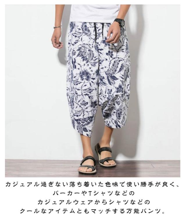 M-5XL すててこ メンズ サルエルパンツ ズボン 袴 パンツ アラジンパンツ クロップドパンツ ワイドパンツ DRYストレッチ 総柄プリント 男 民族風 おしゃれ ステテコ ゆったり カジュアル 7分丈 ユニセックス 接触冷感 冷感パンツ