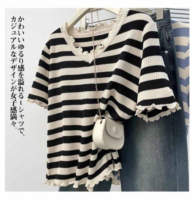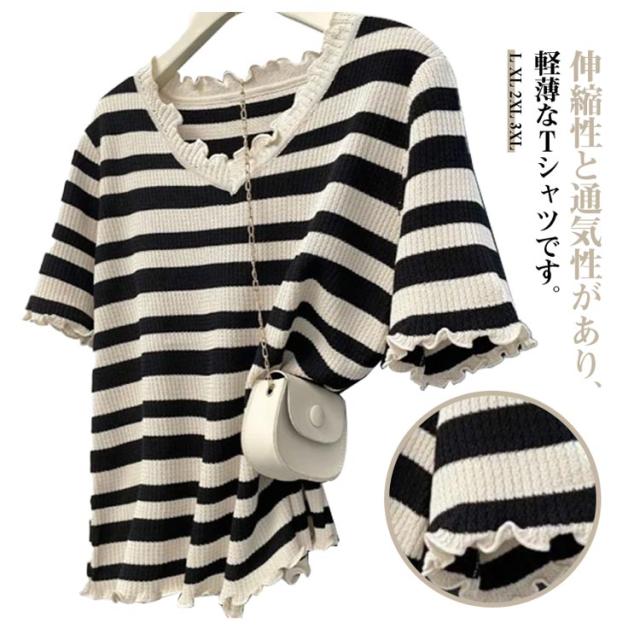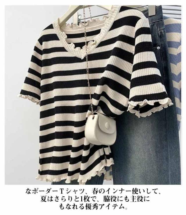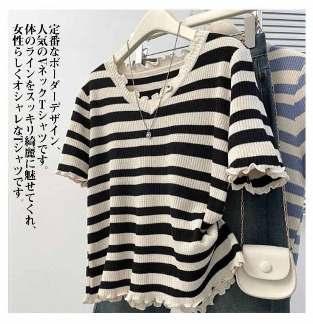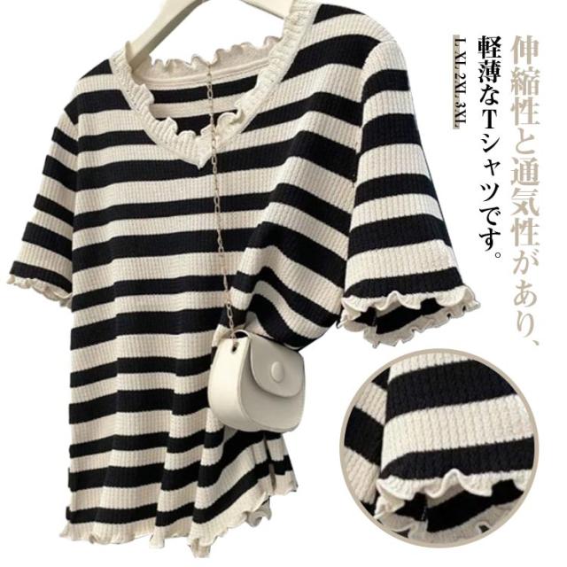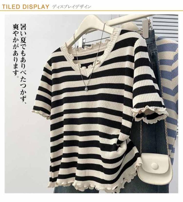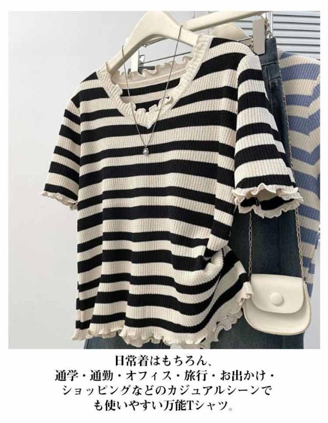 半袖 レディース シンプル Vネック ストライプ柄 オーバーサイズ フリル カットソー 体型カバー ニット Tシャツ トップス ゆったり サマーニット カジュアル 着?せ 夏用 夏服 きれいめ おしゃれ 着回し