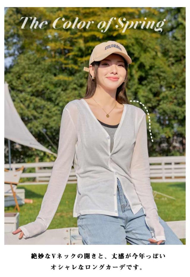 | 今シーズン大人気のロングカラーカーディガンの登場! 薄手のカーデは今すぐ着れて先取り感も完璧。 UV対策や冷房対策にぴったりの素材なので、これからの季節バッグに入れて持ち運んでくださいねデイリーに使いやすい素材を、着回しやすいデザインでご用意しました。 お尻を隠れる丈、さっと羽織るだけで抜け感をプラスしてくれるアイテム。 絶妙なVネックの開きと、丈感が今年っぽいオシャレなロングカーデです。 | |