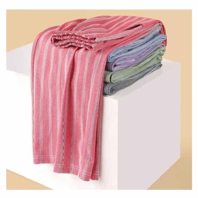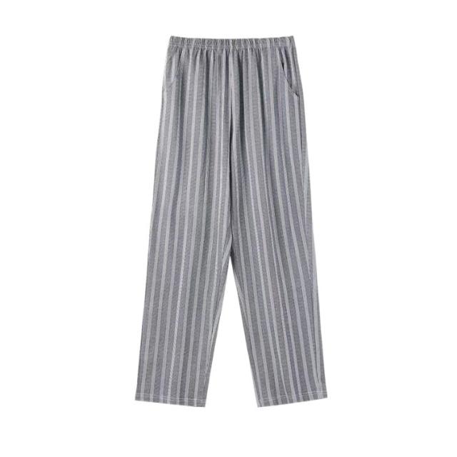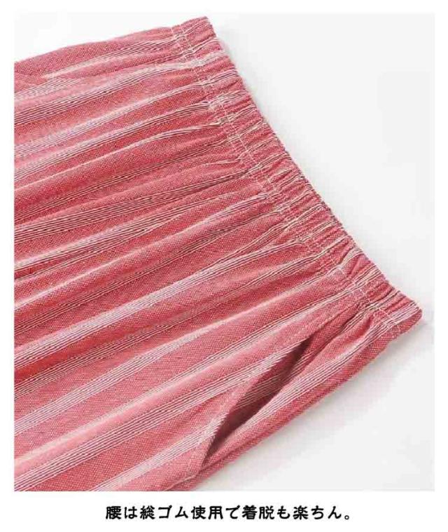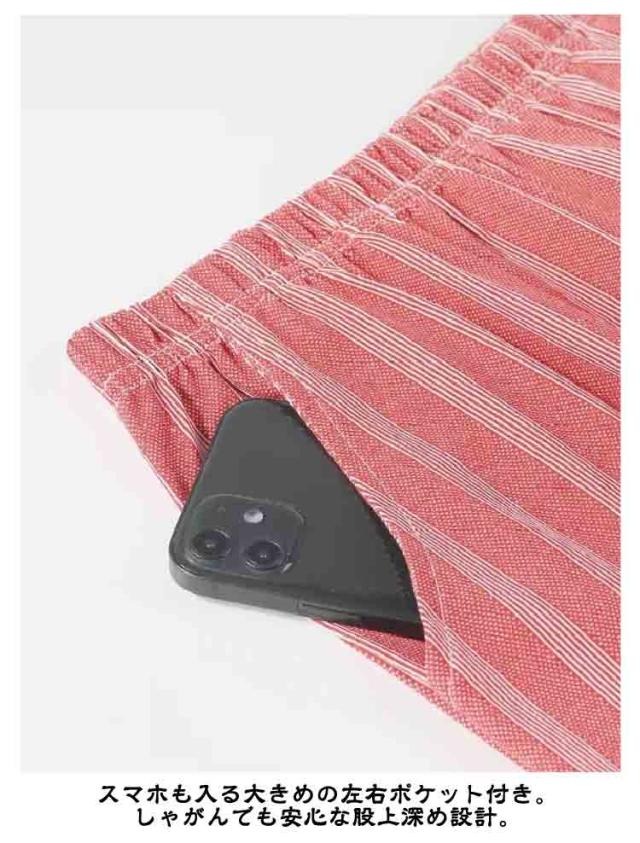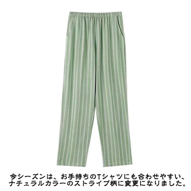 | 汗をかいても肌にべとつきにくい素材。綿で柔らかく、優しい肌触りの快適な着心地。 一日中リラックスできて、おうちタイムにもパジャマにも◎。 今シーズンは、お手持ちのTシャツにも合わせやすい、ナチュラルカラーのストライプ柄に変更になりました。 着心地も見た目も涼しげで、細見え効果も。 腰は総ゴム使用で着脱も楽ちん。調節紐付きです。スマホも入る大きめの左右ポケット付き。しゃがんでも安心な股上深め設計。 | |