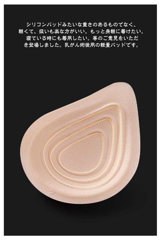 | 超軽量ウレタンパッド。乳がん用全摘フルカップ型。【2枚組】 乳癌手術後すぐの傷口の保護の為はもちろん、デリケートな時にも左右差をなくす為に着用したい。シリコンパッドみたいな重さのあるものでなく、軽くて、扱いも楽な方がいい。もっと身軽に着けたい。寝ている時にも着用したい。等のご意見をいただき登場しました。乳がん術後用の軽量パッドです。 軽くて通気性がよいので夏場の使用も快適。 30℃以下の水の中での着用も可能。(ウレタンですので水は吸収しますが形状が固定されており内部に水が残りにくい仕様) 乳がん用ブラジャーのポケットに入れてお使いいただくか、通常のブラジャー、ブラトップ等に入れて着用下さい。(ポケットなしの場合はかがんだ時に落下する可能性ございます) 手洗いもしくは洗濯ネットに入れ、おしゃれ着洗いコースでの洗濯を推奨します。 | |