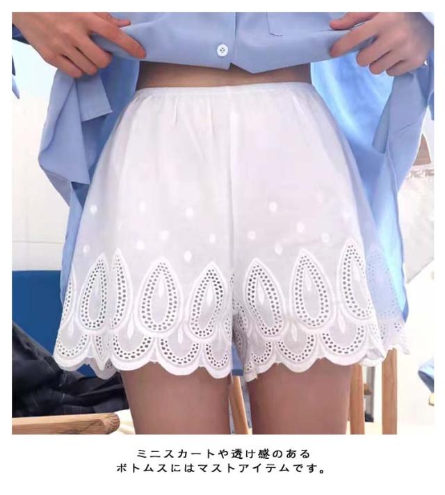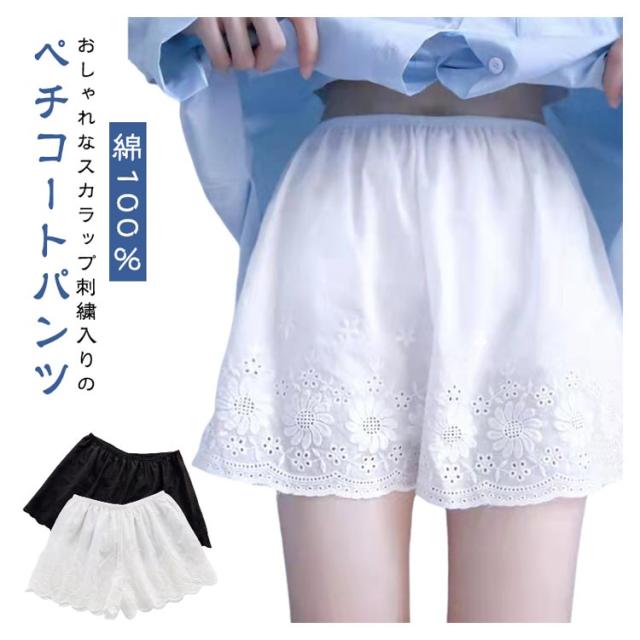 綿100% ペチコート レース インナー ショート 刺? レディース ペチパンツ ペチパンツ 下着 膝上 スカラップ刺繍 ペチパン ショートパンツ ハーフパンツ 体型カバー ウエストゴム 透け対策 透け防止 黒 白