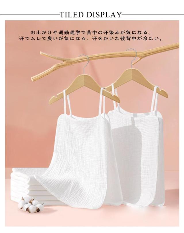 | 服を着たままサッと脱げる!2枚セットの汗取りインナー。 4重ガーゼで肌触りふんわりやわらか。吸水速乾性に優れたコットン素材で、さらっと快適な肌触り♪ 汗染み予防としてはもちろん、汗をかいても丸ごと脱げるサイドオープンシルエット◎ 下着の下に着用すると、より吸汗してくれます◎ お出かけや通勤通学で背中の汗染みが気になる、汗でムレて臭いが気になる、汗をかいた後背中が冷たい。 おうちでのリラックスタイム、運転、スポーツシーンなどにも! | |