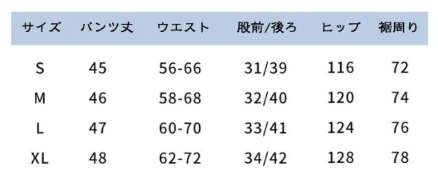 | サイズについての説明 | サイズ パンツ丈 ウエスト 股前/後ろ ヒップ 裾周り ※サイズは当店平置き実寸サイズの為、多少異なる場合がございます。 |