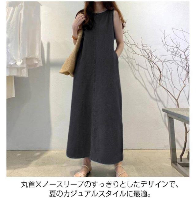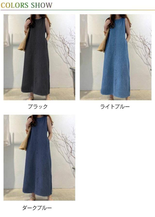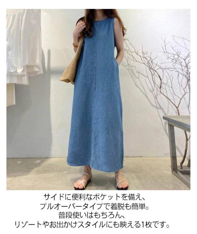 デニムワンピース ノースリーブ ロングワンピース ゆったり 夏ワンピース 大きいサイズ 丸首 カジュアル 着痩せ ポケット付き 夏コーデ 体型カバー 送料無料