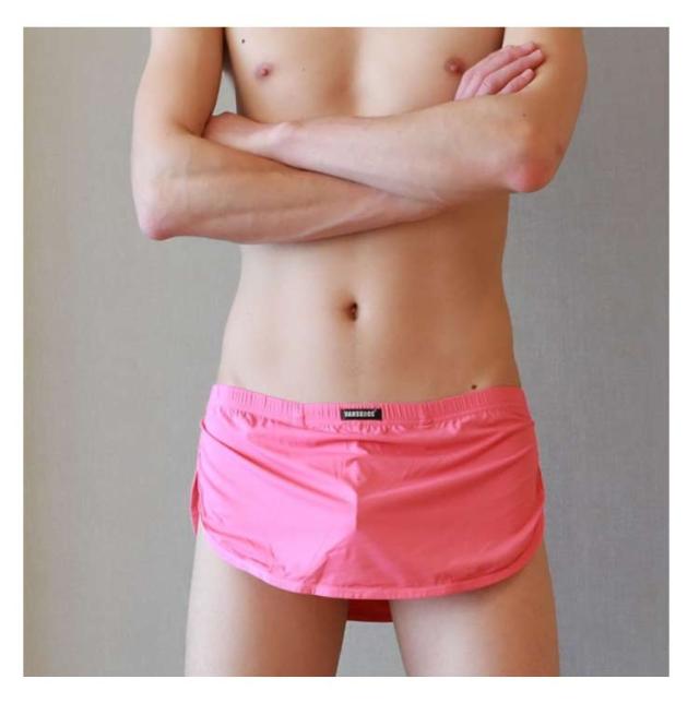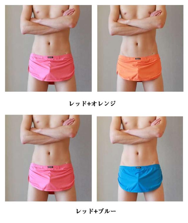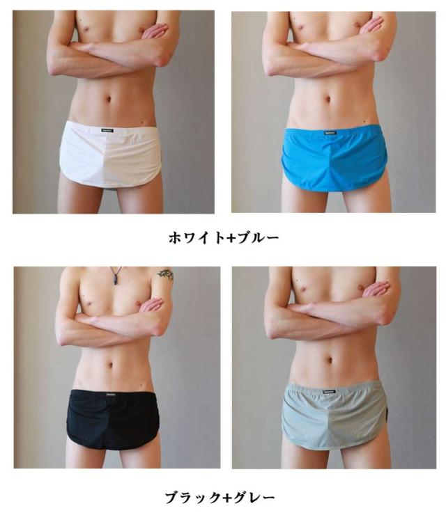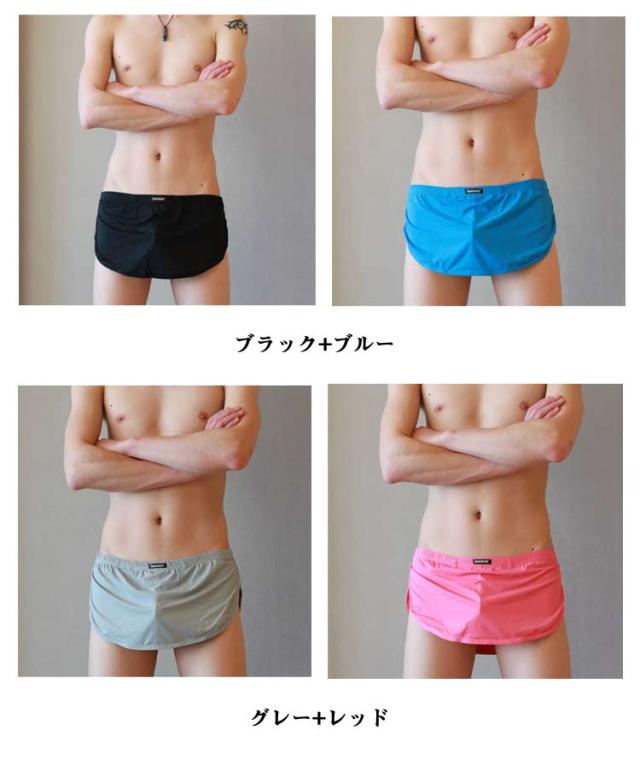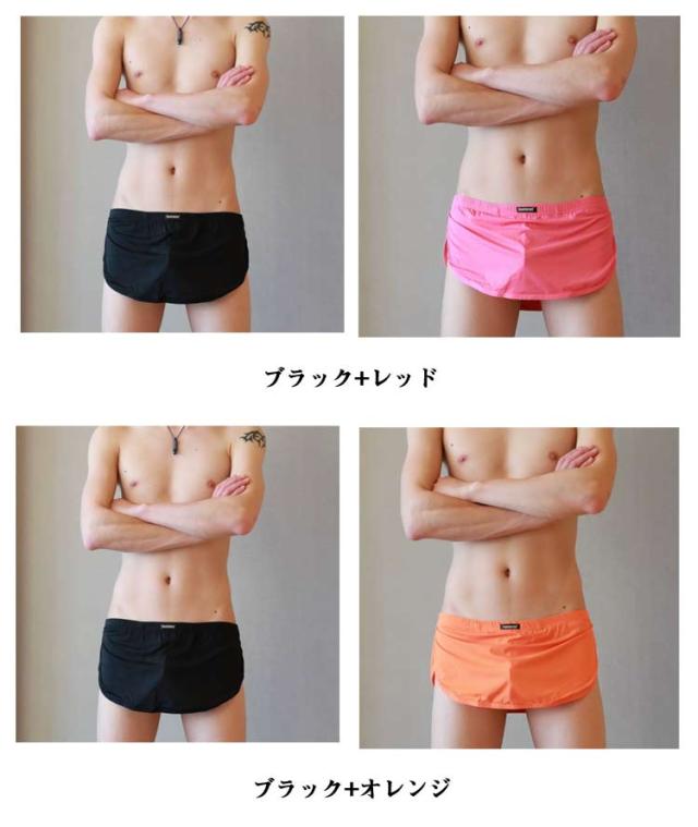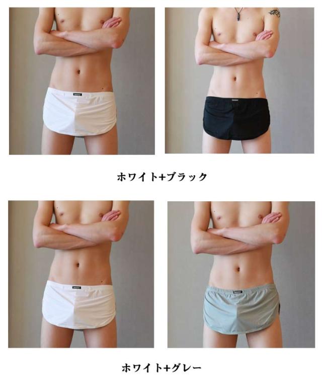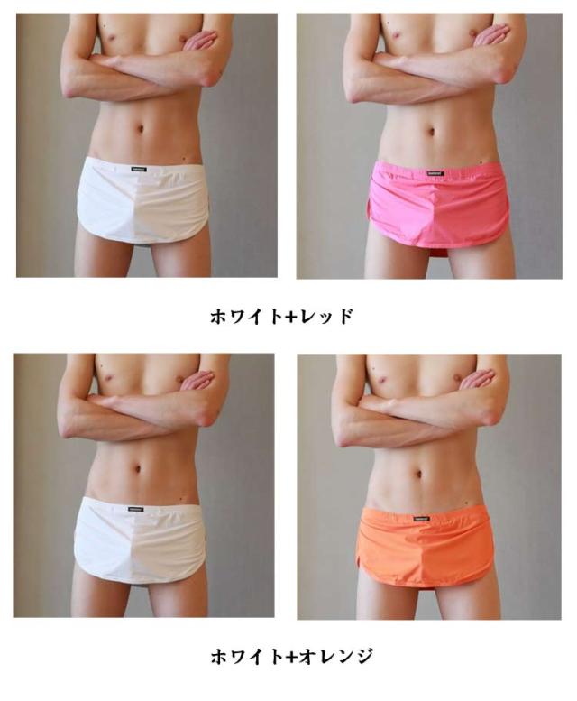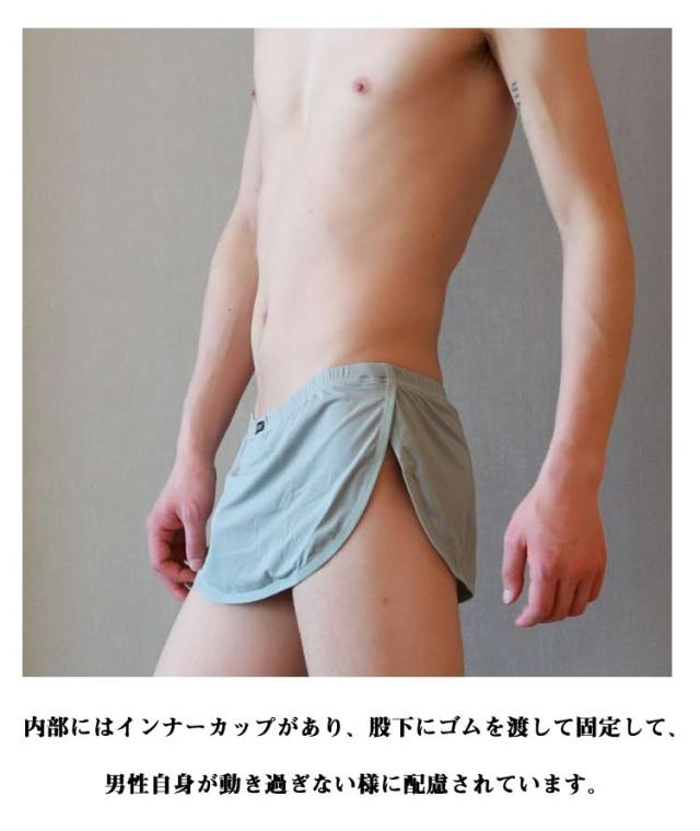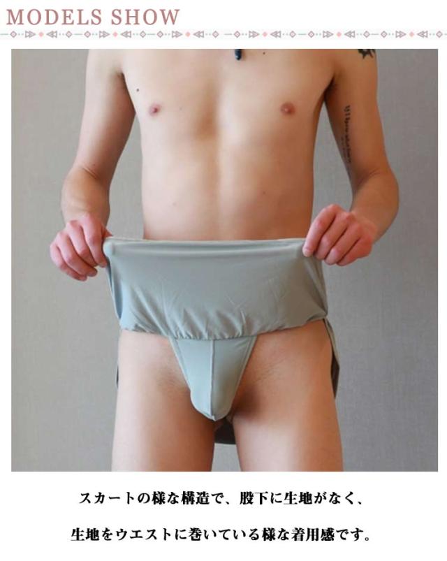 | 履くだけ簡単!メンズ用 スカート型トランクス。 スカートの様な構造で、股下に生地がなく、生地をウエストに巻いている様な着用感です。 内部にはインナーカップがあり、股下にゴムを渡して固定して、男性自身が動き過ぎない様に配慮されています。 フロント左右にとても深いスリットのあるデザインで、足がよく見えて健康的なセクシー感を演出いたします。 | |
