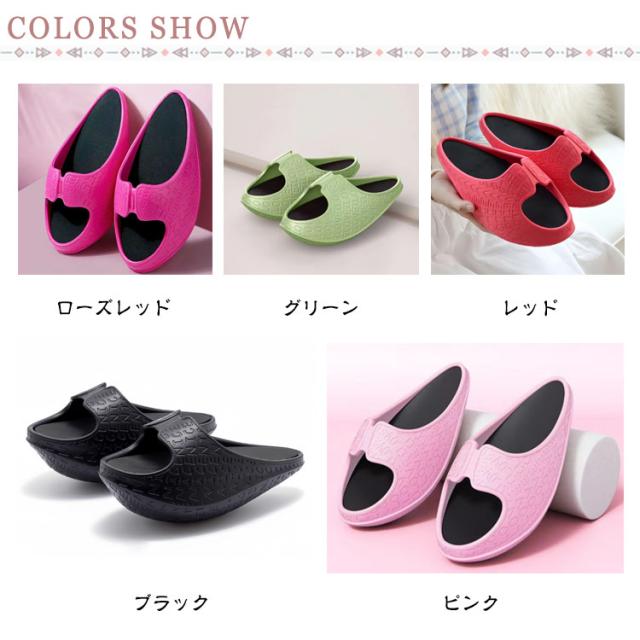 | かかとからつま先にかけて底が曲線を描いているため、不安定な状態で体勢をキープ! 底がぐらぐらするため、ふくらはぎに自然と力が入り、筋肉を刺激してくれる。 不安定な状態をキープすることで体幹力もアップし、美脚効果が期待できる! 滑りにくい素材で安全性も◎軽いので履くだけで簡単にシェイプアップができる。 EVA樹脂を使用したアウトソールは耐久性が高いため、へたりにくく長く愛用できるでしょう。 姿勢が良くない方には、これを履くだけで姿勢改善にサポートしてくれるので、継続することで姿勢の改善のほか、足細も目指せる! 一日15分履いて歩くだけで、筋肉を鍛えると脂肪が燃焼し、足裏刺激で結構アップ疲れを緩和させます。 とくに立ち仕事などで疲れているときや足がむくんでいるときには、血行がよくなるとリラックスすることができますよ。 | |