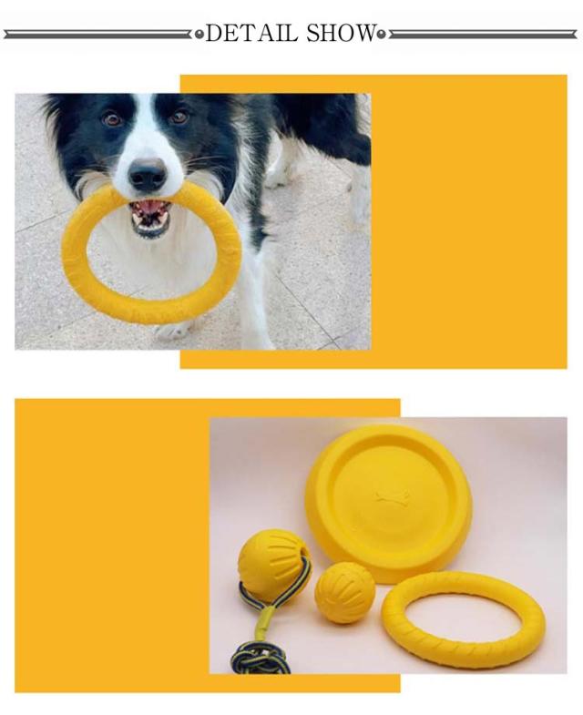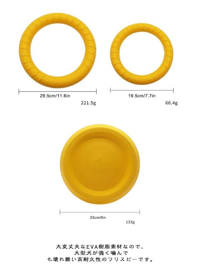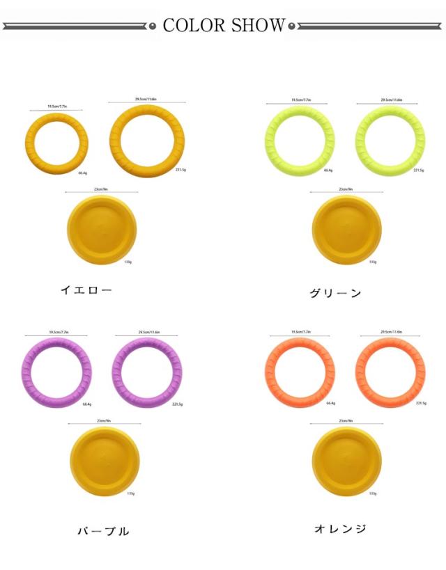 | 柔らかくて高耐久のEVA樹脂製のリングフリスビーです。【S/Lリング+フライングディスク】3点セット 大変丈夫な素材で出来ているので、噛む事が好きなわんちゃんにぴったりのおもちゃです。 フリスビーとして投げたり、転がしたり、わんちゃんと引っ張りっこしたり、色々な遊び方が出来ます。 水を吸収しない大変軽量な素材なので、プールで浮かせて遊ぶ事も出来ます。 大変丈夫なEVA樹脂素材なので、大型犬が強く噛んでも壊れ難い高耐久性のフリスビーです。 | |