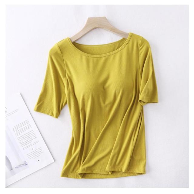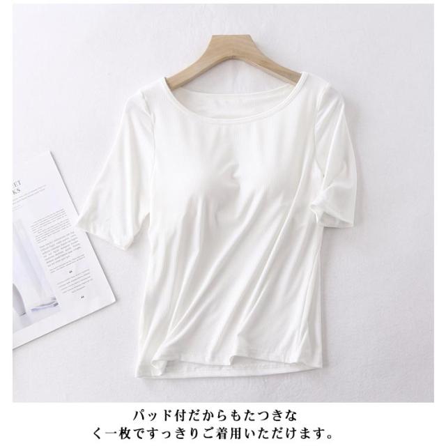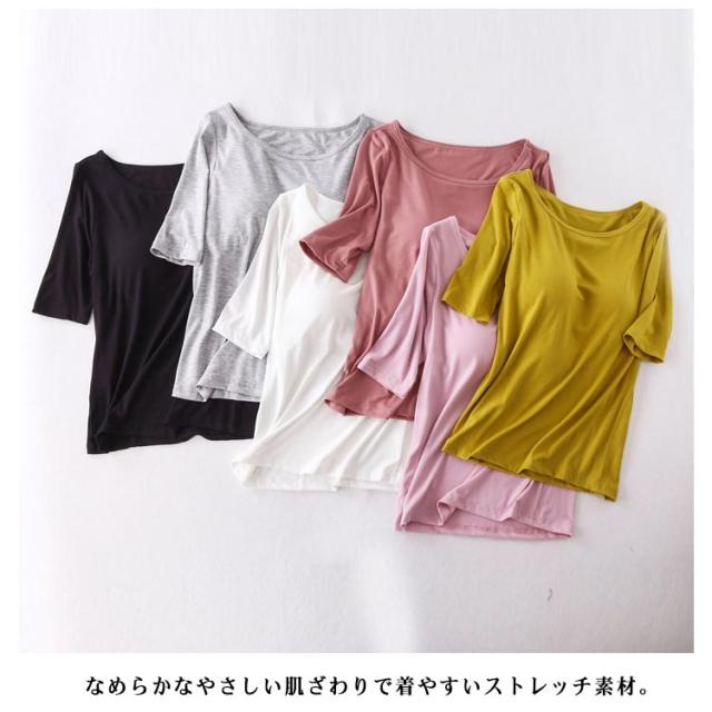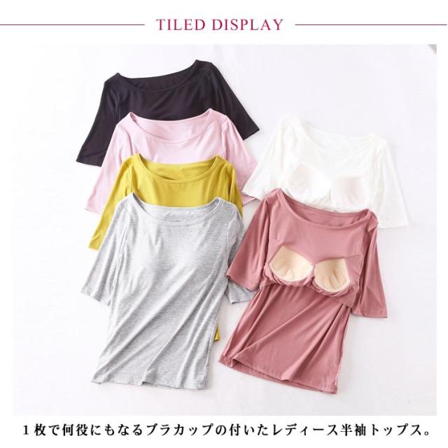 レディース 締め付けない ブラ内蔵 カップ付き 半袖 ブラトップ Tシャツ Uネック ボートネック 無地 盛れる 育乳 トップス ノンワイヤー 楽チン カップ付き 半袖Tシャツ 快適 伸縮性 締め付けない バストケア 春夏 ブラック グレー イエロー ホワイト
