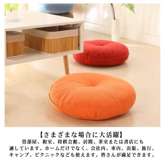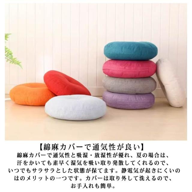 | やさしい座り心地/座布団 2個セット 直径60cm 厚め15cm 【やさしい座り心地】適度な柔らかさ、座る時に、体圧を吸収、分散して身体を支えるので、圧迫感を感じません、長く座っても疲れません。オフィスなどでのデスクワークや長距離運転が多い方にオススメいたします。 【綿麻カバーで通気性が良い】 綿麻カバーで通気性と吸湿・放湿性が優れ、夏の場合は、汗をかいても素早く湿気を吸い取り発散してくれるので、いつでもサラサラとした状態が保てます。静電気が起きにくいのはのメリットの一つです。カバーは取り外して洗えるので、お手入れも簡単。 【さまざまな場合に大活躍】 畳部屋、和室、将棋会館、居間、茶室または書店にも適しています。ホームだけでなく、会社内、車内、出張、旅行、キャンプ、ピクニックなども使えます。皆さんが満足できます。 | |
