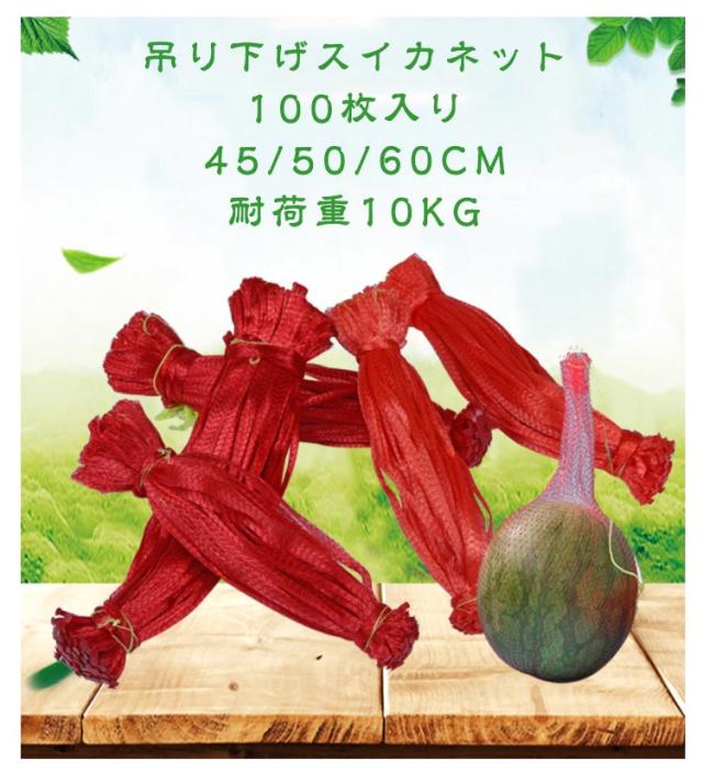 | 吊り下げスイカネット 100枚入り 45/50/60cm 耐荷重10kg すいかをネットにかぶせるだけで、持ち運びに便利です。 高密度のポリプロピレン 素材でできていて、耐腐食性があります。、日焼け止め、上質、軽さと通気性、耐久性等の特徴があります。 ショッピング、ピクニック、テールゲート、学校、おもちゃ、ビーチや子供のおもちゃを車に持ち込むなど、旅行に最適です。 ジャガイモ、タマネギ、ニンジン、ニンニク、ナス、オレンジ、リンゴ、水産物などの野菜や果物の様々な種類の包装に適しています。 | |