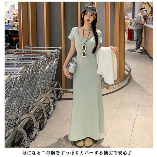 カップ付きワンピース 半袖 ワンピース フレアワンピース ロング丈 スクエアネック aライン カットソー カップ付きワンピース マキシワンピース 無地Tシャツ ストレッチ 伸縮性 通気性 締め付けない ワンピース 部屋着 大きいサイズ