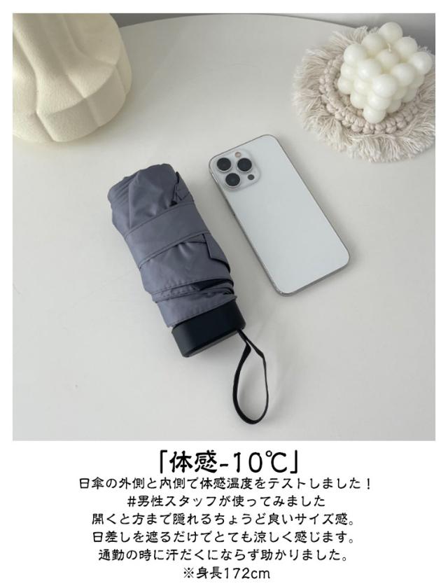 | UPF50+ 極小 晴雨兼用 直径90cm 6本骨 ストラップ&収納袋付き 折りたたみ傘 極小サイズの日傘が登場! 軽量220g、力がいらない手動式にリニューアル♪ 『なぜ日傘が必要なのか?』 ▼強すぎる日光の弊害 ・直射日光を浴びることで熱中症になる恐れがある ・紫外線による光老化でしわ、たるみ、シミができる ・体温上昇によって汗をかきあせもになる恐れがある 特徴 ■「4つの特徴」 \いつでも日差しからあなたを守る「極小日傘」/ ・極小サイズ ・軽量220g ・体感-10℃ ・晴雨兼用 ■「持ち運びに最適!極小サイズ」 片手に収まるたった14cm ポケットやミニバッグにすっぽり入るサイズ感。 ■「スマホよりも軽い」 スマホよりも軽いわずか220gで持ち運び楽々♪ ■「体感-10℃」 日傘の外側と内側で体感温度をテストしました! #男性スタッフが使ってみました 開くと方まで隠れるちょうど良いサイズ感。 日差しを遮るだけでとても涼しく感じます。 通勤の時に汗だくにならず助かりました。 ※身長172cm ■「晴雨兼用」 急な雨でも安心! 撥水加工◎ ■「直径90cm」 体がすっぽり入るワイドなサイズ。 ■「6本骨設計」 耐久性・耐風性に優れています。 ■「ストラップ&収納袋付き」 ストラップと収納袋が付属しているので持ち運びに便利です♪ | |