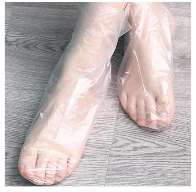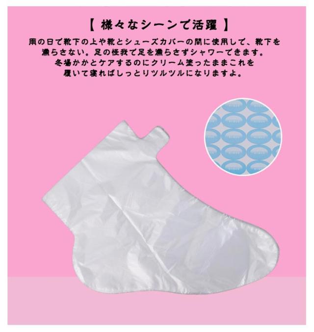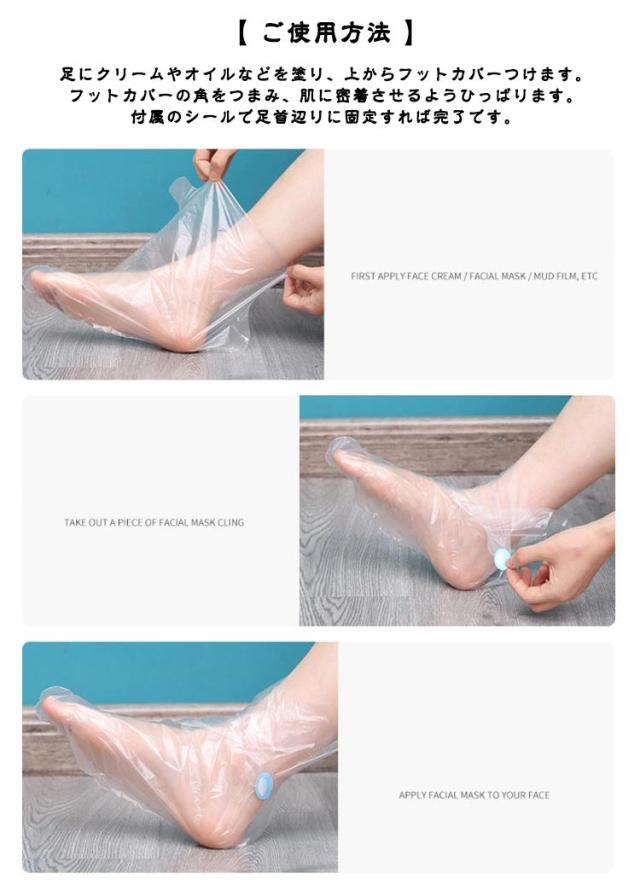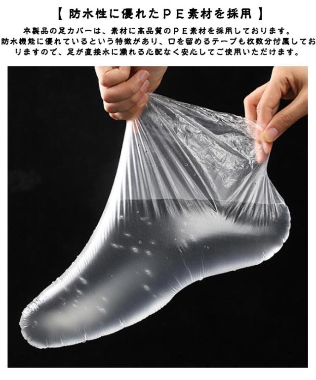 | 足カバー300枚、留めシール300枚のセット 【 防水性に優れたPE素材を採用 】 本製品の足カバーは、素材に高品質のPE素材を採用しております。防水機能に優れているという特徴があり、口を留めるテープも枚数分付属しておりますので、足が直接水に濡れる心配なく安心してご使用いただけます。 【 様々なシーンで活躍 】雨の日で靴下の上や靴とシューズカバーの間に使用しで、靴下を濡らさない。足の怪我で足を濡らさずシャワーできます。冬場かかとケアするのにクリーム塗ったままこれを履いて寝ればしっとりツルツルになりますよ。 【 ご使用方法 】 足にクリームやオイルなどを塗り、上からフットカバーつけます。フットカバーの角をつまみ、肌に密着させるようひっぱります。付属のシールで足首辺りに固定すれば完了です。 | |