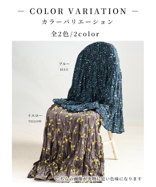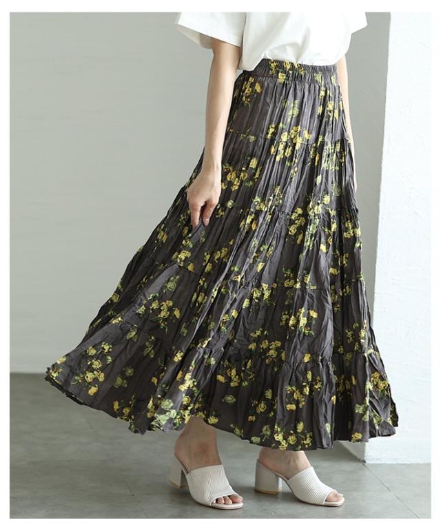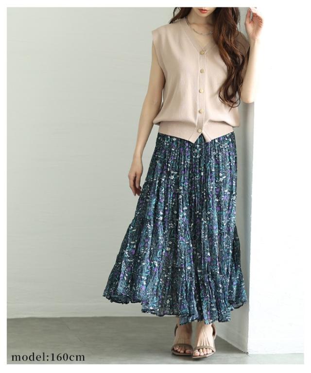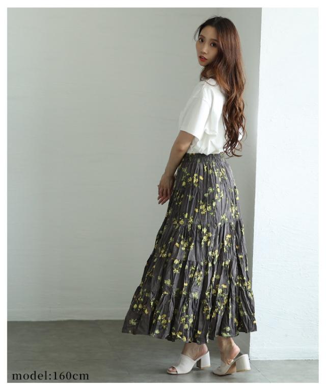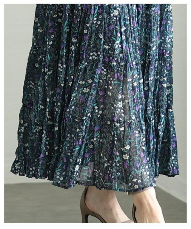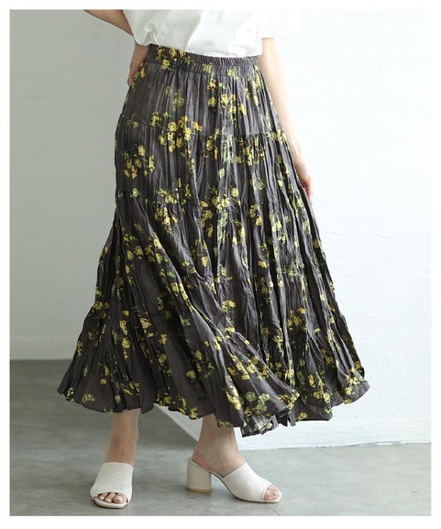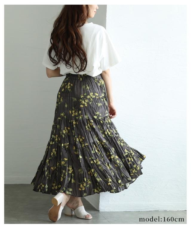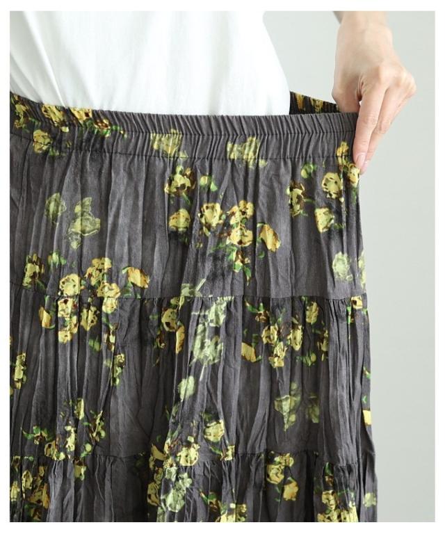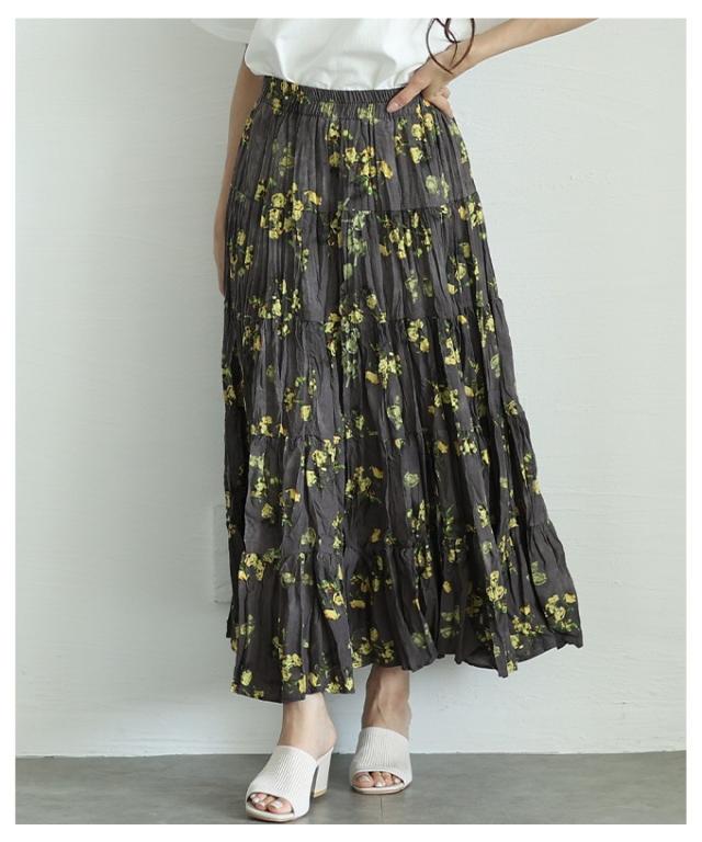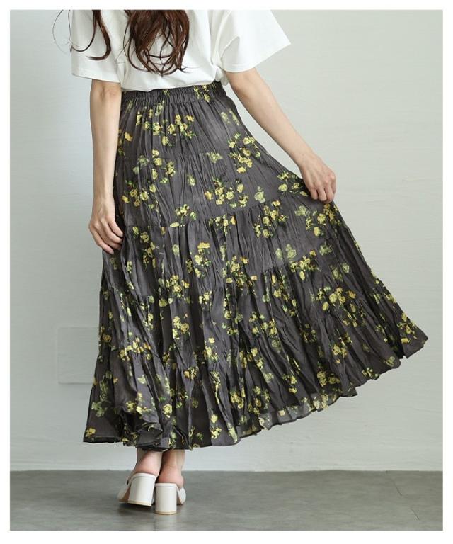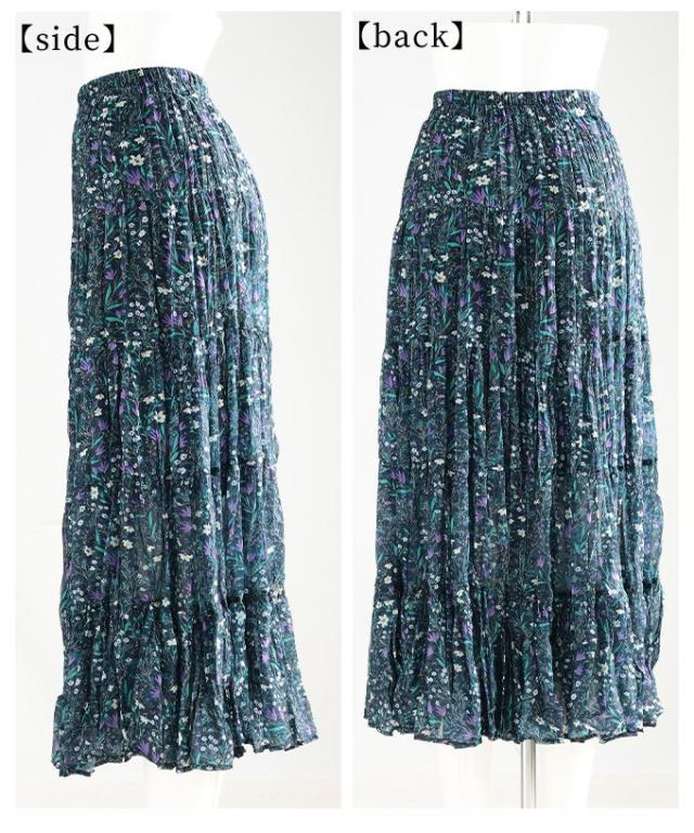 特徴: 小花柄 総柄 ウエストゴム ティアード フレア シワ加工 裏地