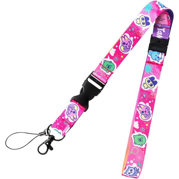 ビビッドピンクのキュートな模様に、ユニークなキャラクターたちがデザインされたネックストラップです。