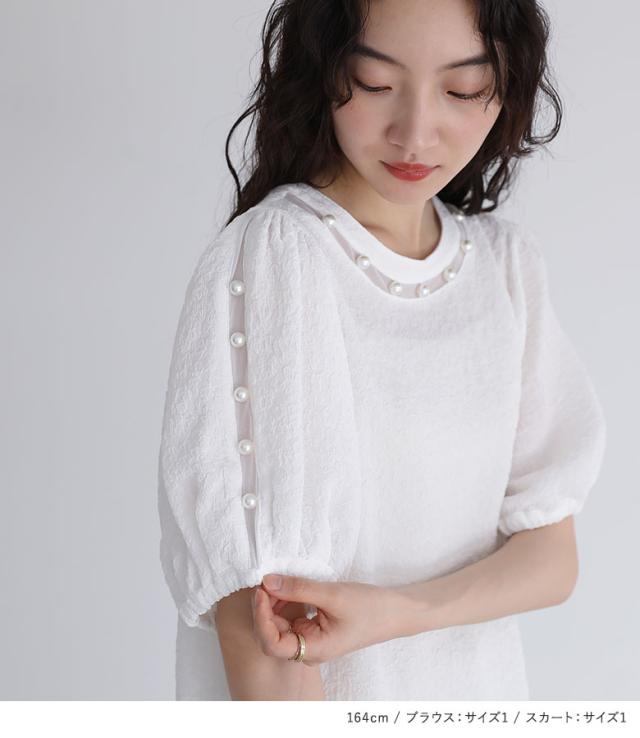 ホワイト 白 オフホワイト ベージュ 202507 2点セット プレゼント ブラウス レディース トップス 半袖 プルオーバー シャツ フェイクパール ジャカード ジャガード シアー 薄手 春 夏 クルーネック ショート丈 ミディ丈 ミドル丈 無地 透け感 レイヤード 重ね着 おうちで洗える カジュアル レトロ クラシカル シンプル ナチュラル キレカジ フェミニン ガーリー 二の腕カバー Sサイズ Mサイズ Lサイズ LLサイズ 3Lサイズ XLサイズ ぽっちゃり 体型カバー 大きいサイズ プラスサイズ 10代 20代 30代 40代 50代 60代 低身長 高身長 女子会 通学 お買い物 お出掛け 旅行 リゾート somari imagination ソマリイマジネーション 可愛い系 大人女子 大人可愛い お洒落可愛い 大人カジュアル 上品 きれいめ スカート ボトムス ロング丈 フレアスカート フリル チュール サスペンダー付き 取り外し可 ロングスカート マキシ丈 フレア ポケット 福袋 コーディネートセット コーデセット 中身が見える福袋 上下セット ギフトセット[ID]12co0i3[フェイクパール付きフラワージャカードブラウス×フリルサスペンダー付きフレアスカートコーデ2点SET]