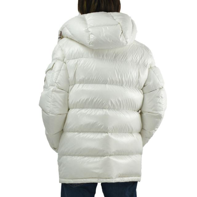 トリコロールのアクセントと袖のパッチポケットが特徴的な、モンクレールらしいフード付きパファーです。