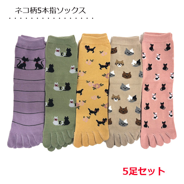 5本指ソックス 5足セット 猫柄 かかと付き 口ゴムゆったり ネコ クルー丈 靴下 レディース 1000円ぽっきり 送料無料