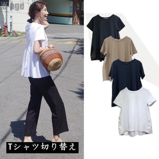 Tシャツ レディース トップス 夏 半袖 可愛い 無地 切り替え 後ろプリーツ 黒 プルオーバー 体型カバー サマー 夏服 OL 大人 シンプル