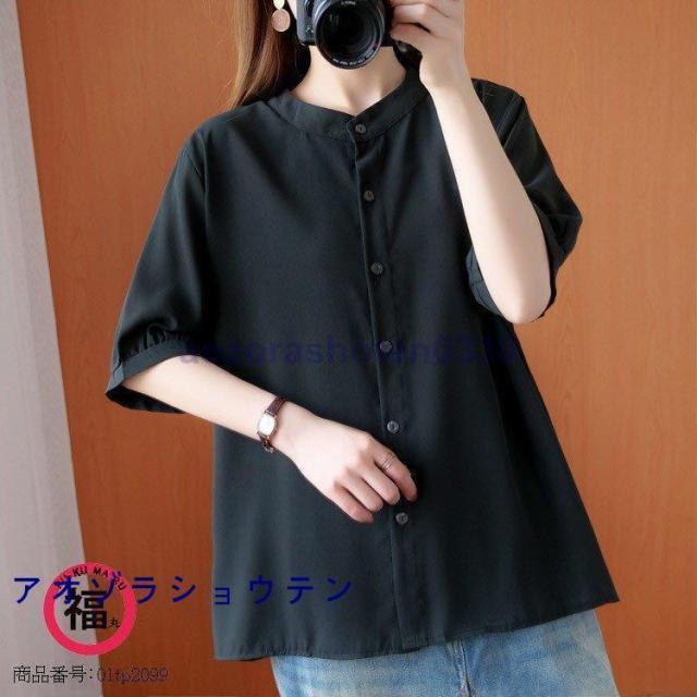シャツ 夏 ブラウス 五分袖 トップス シャツブラウス レディース 無地 ブラック 立ち襟 大きいサイズ 柔らか 通気性 シンプル ゆったり 快適 30代 40代