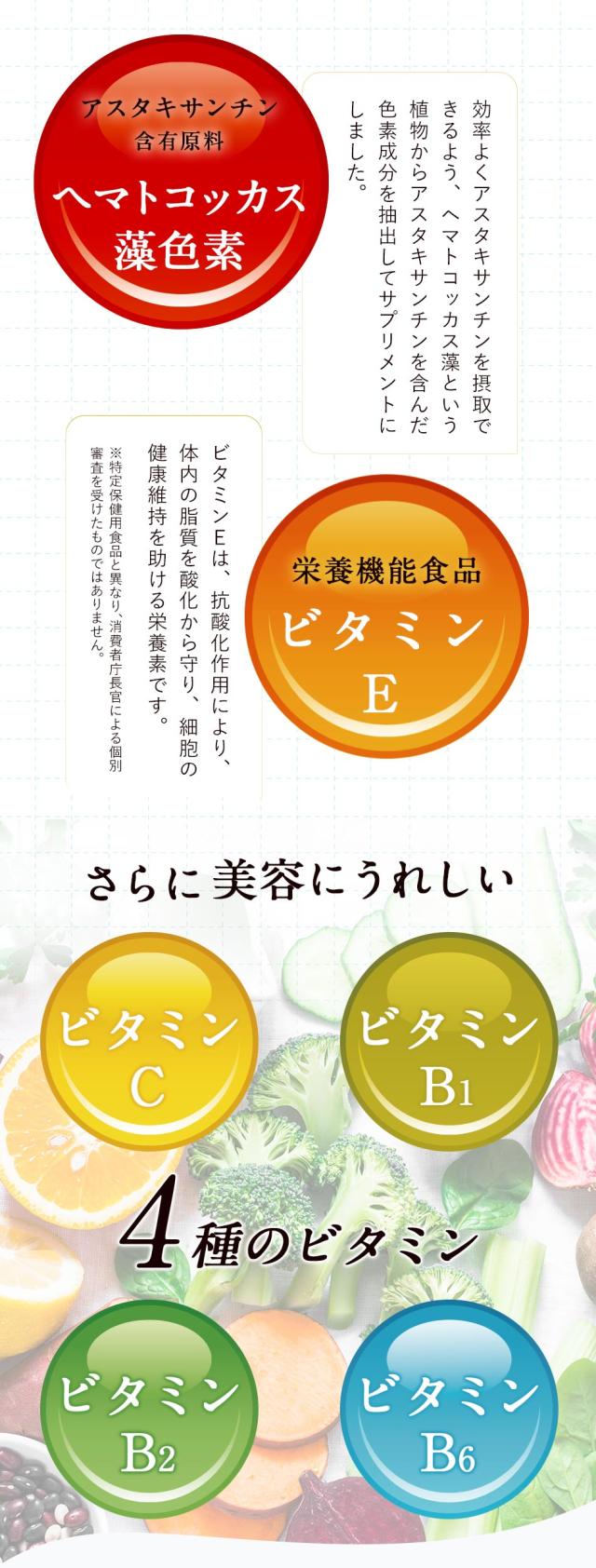サフラワー油(国内製造)、ビタミンE含有植物油/ゼラチン、グリセリン、ビタミンC、植物レシチン(大豆由来)、ミツロウ、グリセリン脂肪酸エステル、ヘマトコッカス藻色素、ビタミンB2、ビタミンB6、ビタミンB1