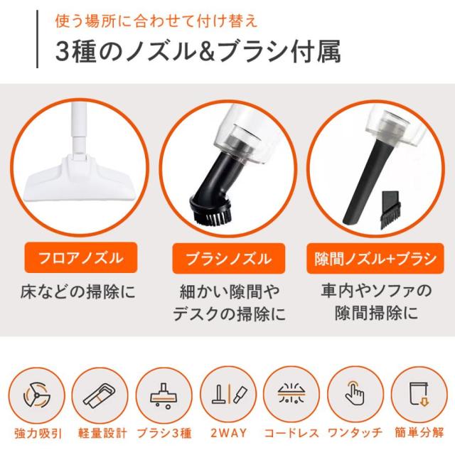 掃除機 コードレス 軽量 ハンディにもなる 水洗い 強力吸引 3種ブラシ 充電式 ハンディ掃除機 紙パック不要 2WAYコードレス掃除機