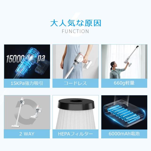 掃除機 コードレス 軽量 ハンディ 新生活 15000pa 強力吸引 5種類ノズル usb充電式 上下70°/左右90°調整 HEPAフィルター