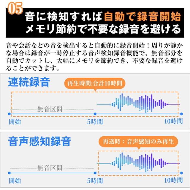 【VOR音声検知で無駄なく録音!】VOR音声検知録音機能により、周囲の音を自動で検知し、録音を開始します。これにより、重要な会話を逃さずに記録し、無音部分を自動でカットして容量の無駄を防ぎます。録音データの確認も簡単で、効率的に情報を整理することができます。プレゼンテーションやミーティングでの重要なポイントを確実に捉えるために、大変便利です。