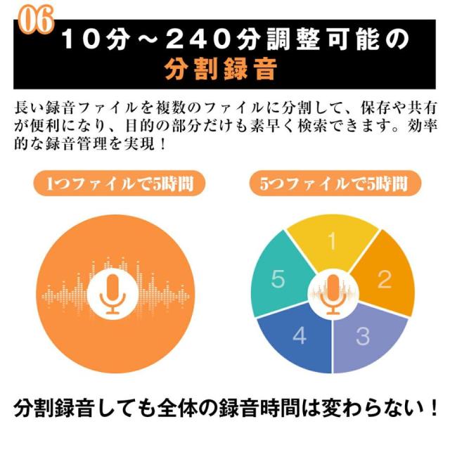 【分割録音でデータ整理も簡単!】長時間の録音データを自動的に設定した時間ごとに分割できます。これにより、長い録音ファイルも扱いやすくなり、データ整理が容易になります。効率的にデータを管理できるため、必要な情報を素早く見つけることができます。