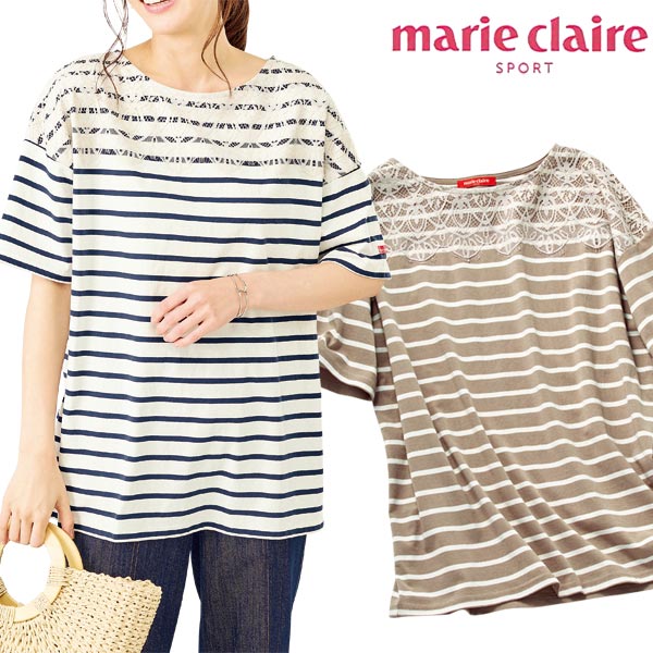 marie claire SPORT ボーダーTシャツ 綿100% レース付 吸水速乾 フェミニンフレンチボーダー ゆったりシルエット 春夏 レディース 961576