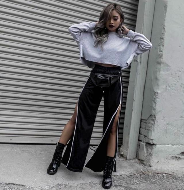 トレンドのスポーツミックスに最適なハイスリットワイドパンツです。サイドのラインにハイスリットなデザインだからセクシーさと美脚見せ効果も