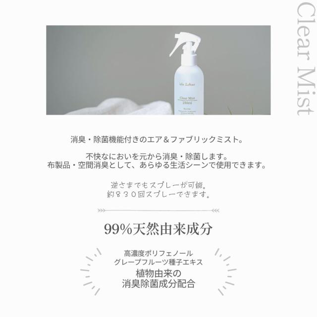 99%以上天然由来。布にも空間にも使える消臭除菌ミスト。植物の力でやさしくニオイを分解。安心の日本製。