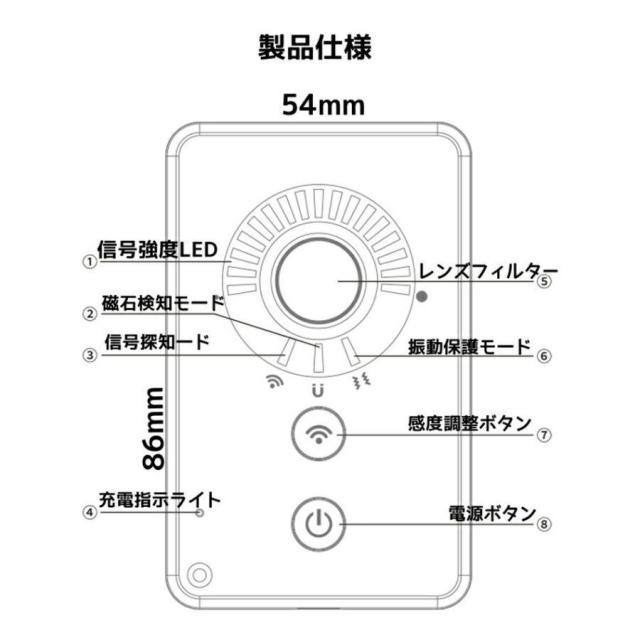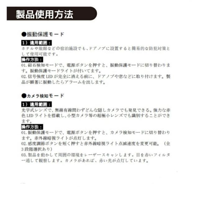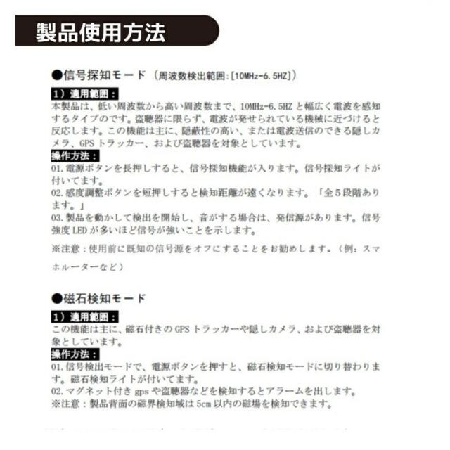 【カメラ検知モード★磁石付きのGPS発見】この機能は主に、磁石付きのGPSトラッカーや隠しカメラ、および盗聴器を対象としています。マグネット付きgpsや盗聴器などを検知するとアラームを出します。 ※注意:製品背面の磁界検知域は5cm以内の磁場を検知できます。