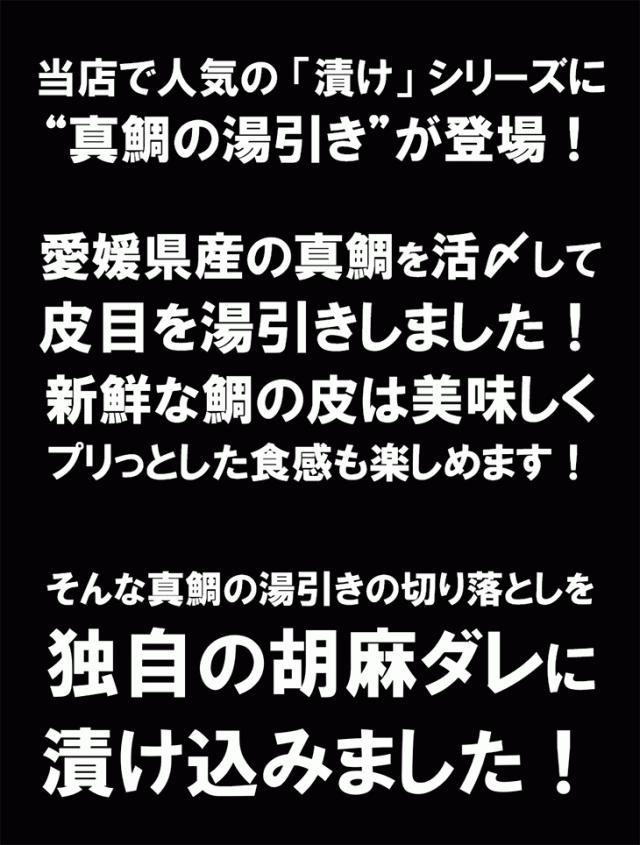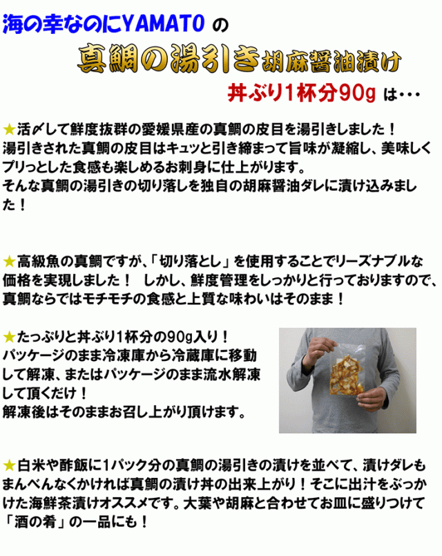 解凍してご飯にのせるだけ!真鯛の湯引き胡麻醤油漬け 90g 海鮮丼 鯛の漬け丼 鯛茶漬け だし茶漬け 国産 愛媛県産 肴 日本酒に合う