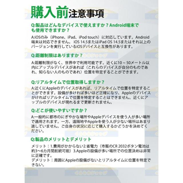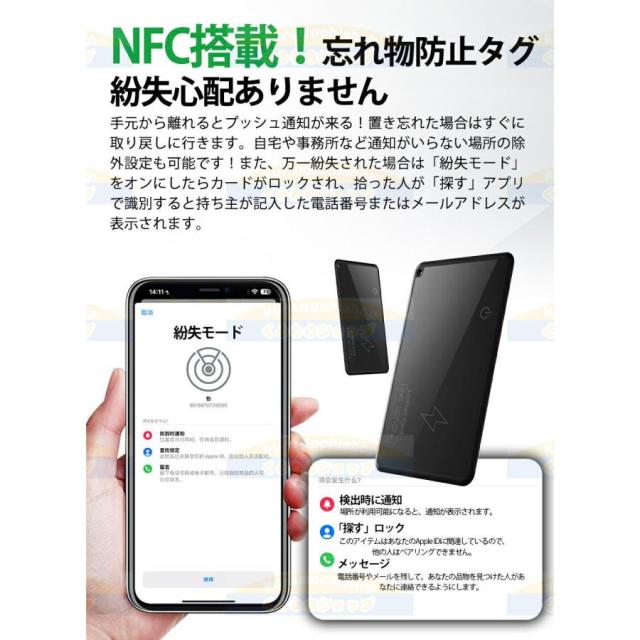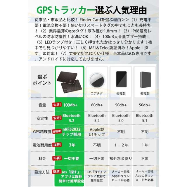 【超高性能 紛失防止タグ!】従来品・市販品と比較!KVWOMS Finder Cardを選ぶ理由>>(1)充電不要!電池交換不要!使い切りスマートタグの中でもっとも長持ち!(2)業界最薄のgpsタグ!厚み僅か1.8mm!(3)IP68最高レベルの防水防塵性!水洗いOK!(4)100dB大音量ブザー搭載!(5)LEDランプ付き!正しく押されたかはっきり分かります!夜中でも見つかりやすい!(6)MFi&Telec認証済み!Apple「探す」に対応!(7)丈夫で折れにくい仕様!※本品はiOS専用です。アンドロイドに対応しておりません。