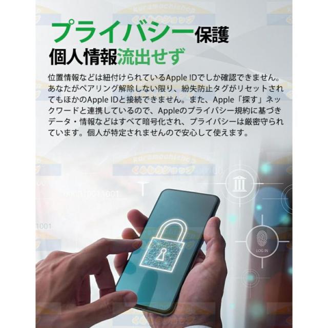 【プライバシー保護】位置情報などは紐付けられているApple IDでしか確認できません。あなたがペアリング解除しない限り、紛失防止タグがリセットされてもほかのApple IDと接続できません。また、Apple「探す」ネックワードと連携しているので、Appleのプライバシー規約に基づきデータ・情報などはすべて暗号化され、プライバシーは厳密守られています。個人が特定されませんので安心して使えます。