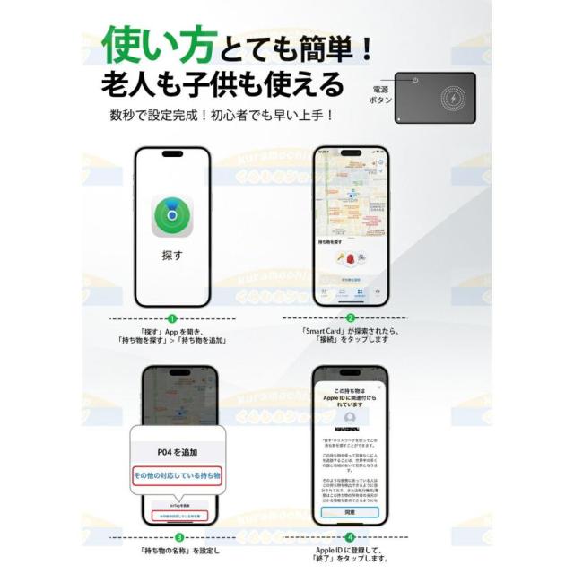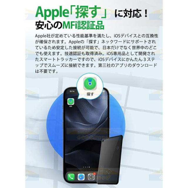 【「探す」に対応!安心のMFi認証品】Apple社が定めている性能基準を満たし、iOSデバイスとの互換性が確保されます。Appleの「探す」ネックワードにサポートされているため安定した接続が可能で、日本だけでなく世界中のどこでも使えます。技適認証も取得済み。iOS専用品として開発されたスマートトラッカーですので、iOSデバイスにかんたん3ステップでスムーズに接続できます。第三社のアプリのダウンロードは不要です。