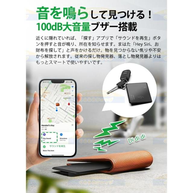 【音を鳴らして見つける!】近くに隠れていれば、「探す」アプリで「サウンドを再生」ボタンを押すと音が鳴り、所在を知らせます。まはた「Hey Siri、お財布を探して」と声をかけるだけ。物を見つからない焦りや不安から解放されます。従来の探し物発見器、落とし物発見器よりはもっとスマートで使いやすいです。