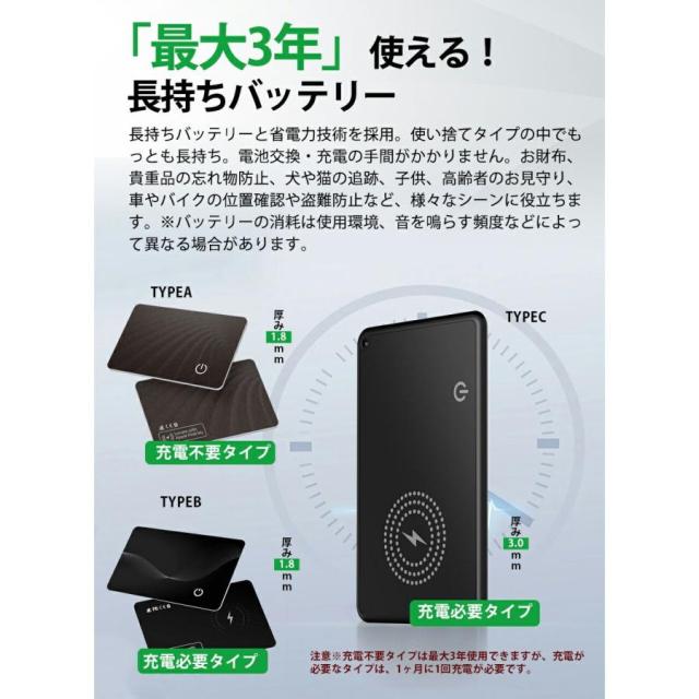 【最大3年使える!】長持ちバッテリーと省電力技術を採用。使い捨てタイプの中でもっとも長持ち。電池交換・充電の手間がかかりません。お財布、貴重品の忘れ物防止、犬や猫の追跡、子供、高齢者のお見守り、車やバイクの位置確認や盗難防止など、様々なシーンに役立ちます。※バッテリーの消耗は使用環境、音を鳴らす頻度などによって異なる場合があります。