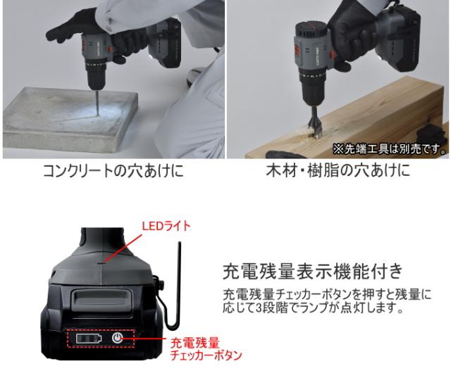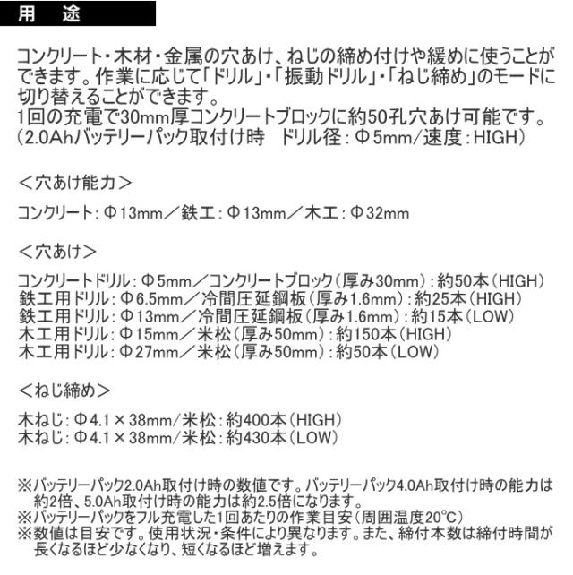 | 特徴 | コンクリート・木材・金属の穴あけ、ねじの締め付けや緩めに。 作業に応じて「ドリル」・「振動ドリル」・「ねじ締め」のモードに切り替えることができます。 1回の充電で30mm厚コンクリートブロックに約50孔穴あけ可能です。 (2.0Ahバッテリーパック取付け時 ドリル径:Φ5mm/速度:高速) ※高額取り寄せ品のため、ご注文後のキャンセル、返品はお受けできませんのでご了承ください。 ■そのほかの電動ドライバーはこちら↓ 電動ドライバー |