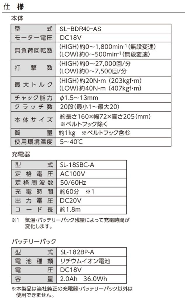 | 充電器(SL-18SBC-A) | 定格電圧:AC100V 定格周波数:50/60Hz 充電時間:約60分(※気温・バッテリーパックの残量によって充電時間が変化します。) 出力電圧:DC20V コード長:(約)1.8m |