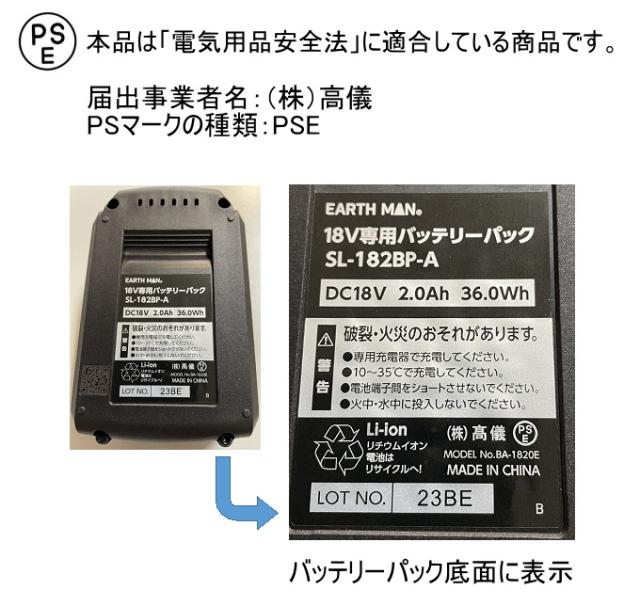 | バッテリーパック(SL-182BP-A) | 電池種類:リチウムイオン電池 電圧:DC18V 容量:2.0Ah 36.0Wh |