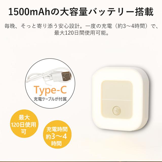 1500mAhの大容量バッテリーを搭載し、1度のフル充電(約3〜4時間)で、なんと最長120日間使用可能(1日10回点灯目安)。Type-Cポートによるスマートな充電方式で、電池交換の手間なし。寝室・玄関・トイレなど、どこに置いてもコードレスでスッキリ。そっと寄り添い続ける、暮らしの“安心”です。